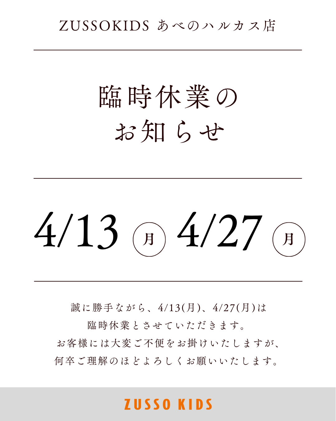 今後ともZUSSO KIDS あべの店をよろしくお願いいたします。